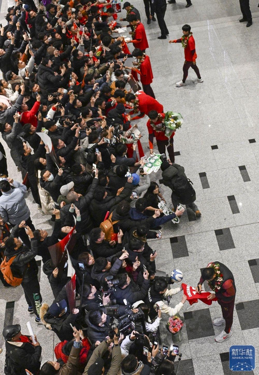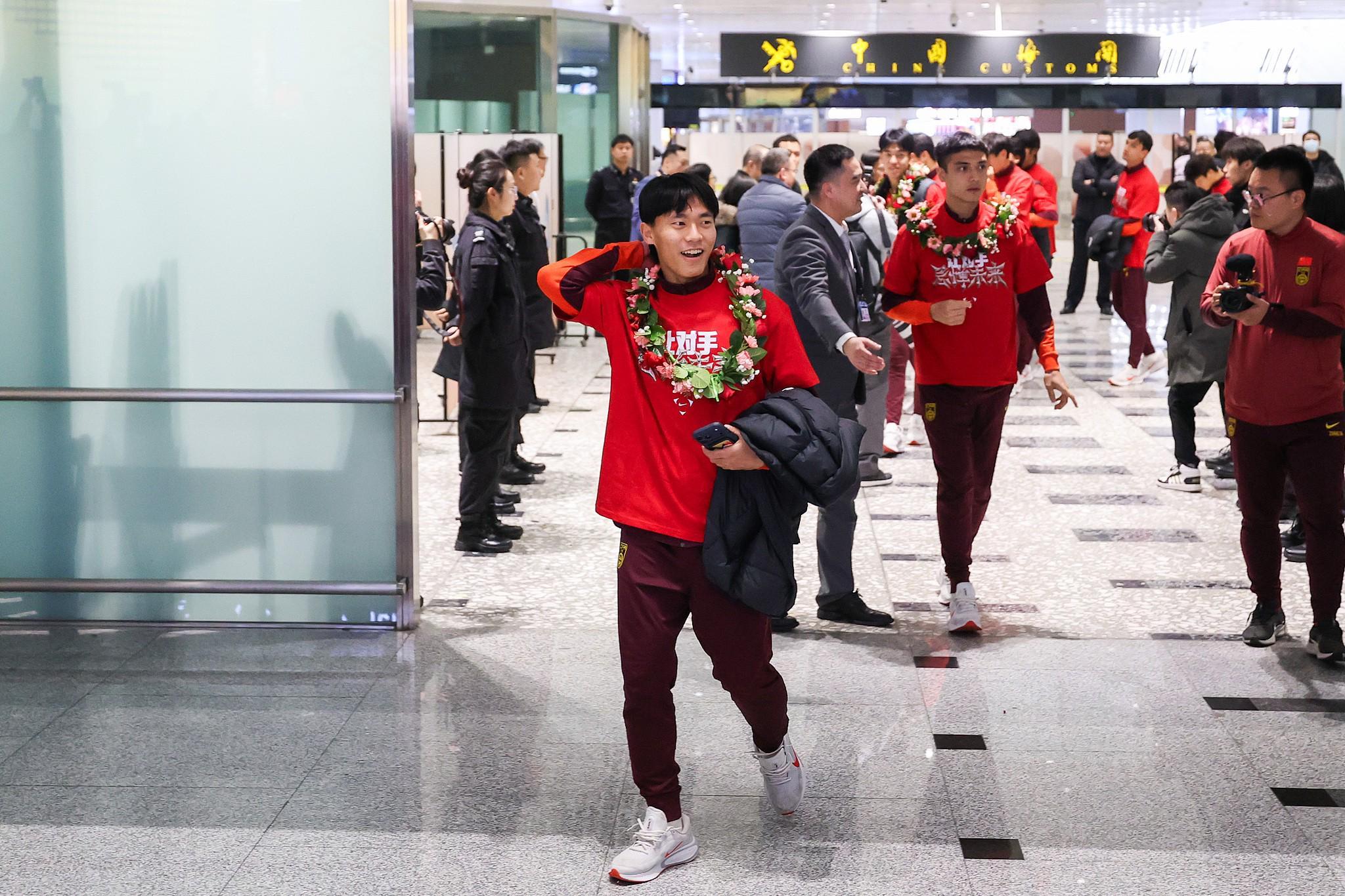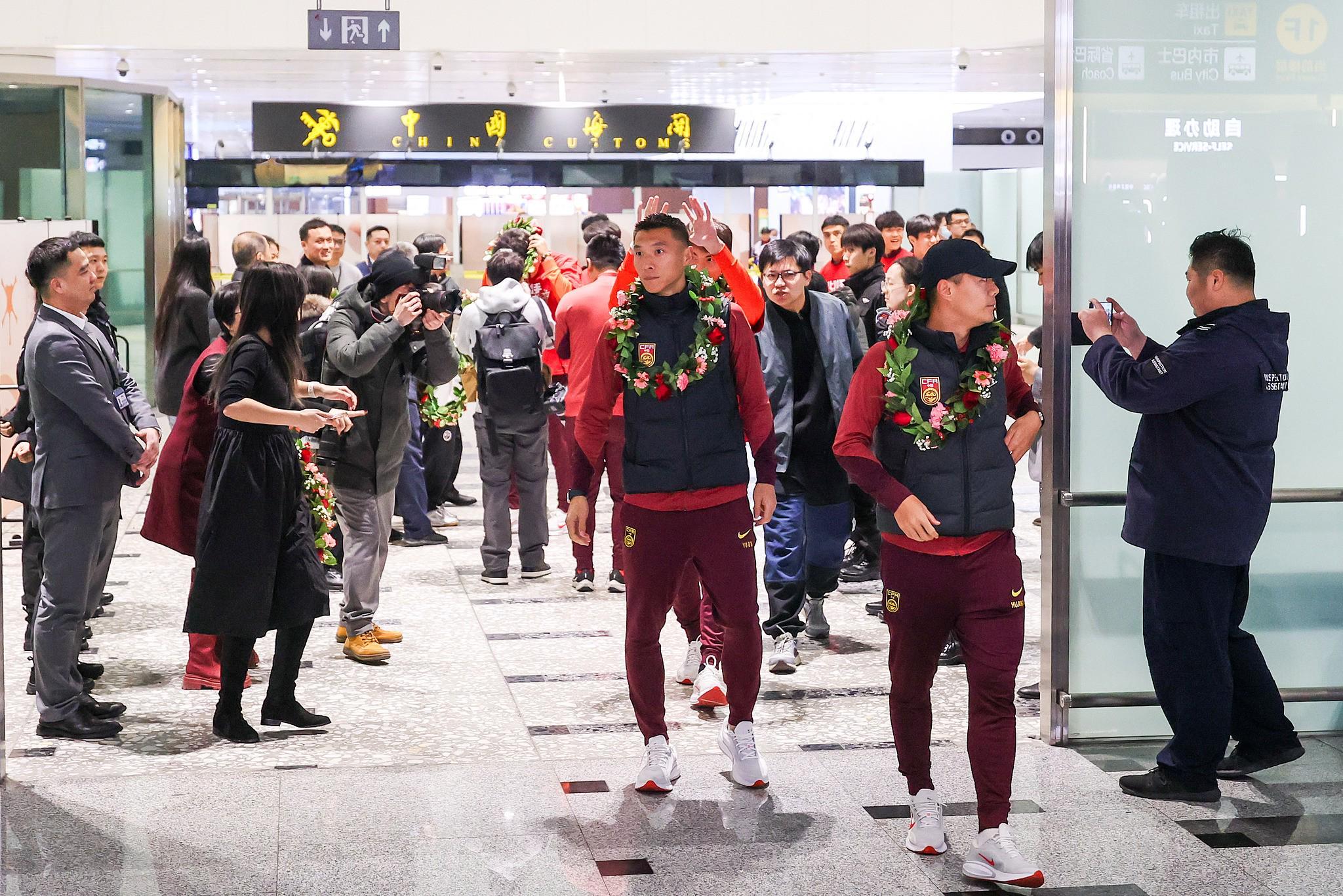 北京时间今天下午,U23国足已乘卡塔尔航空QR892次航班返回国内并降落在北京大兴国际机场,众多球迷来到现场接机。